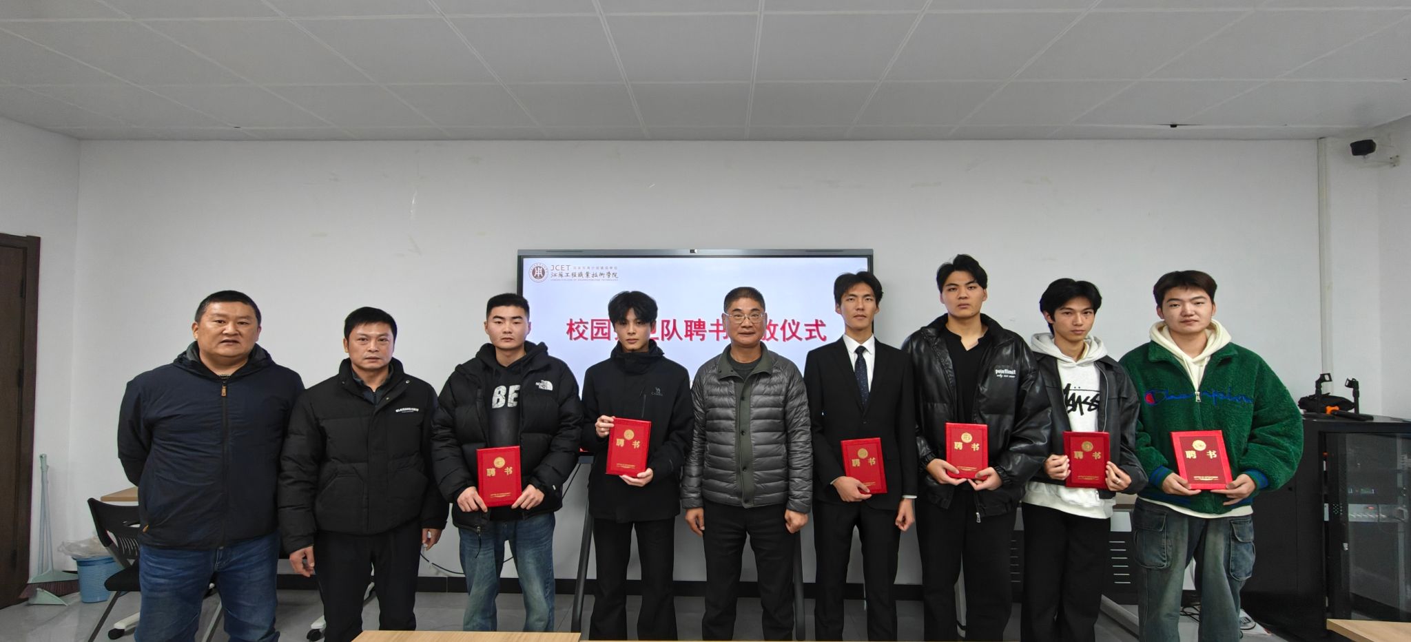 在全场热烈的掌声中,顾培中为护卫队学生逐一颁发聘书,并合影留念。这一纸聘书不仅是对学生们工作的认可,更是一份沉甸甸的责任与期望。接过聘书的同学们面带自豪,纷纷表示将坚守岗位,为打造高质量平安校园贡献自己的力量。